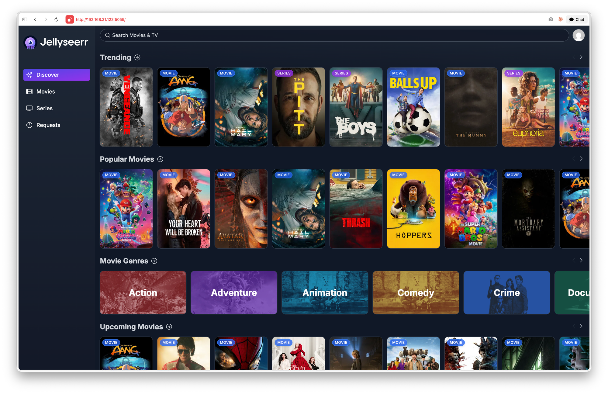 Jellyseerr — интерфейс для поиска фильмов и сериалов, похож на экран Netflix.